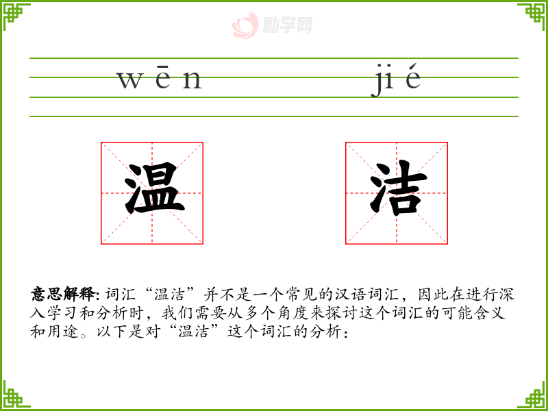 词汇“温洁”并不是一个常见的汉语词汇,因此在进行深入学习和分析时,我们需要从多个角度来探讨这个词汇的可能含义和用途。以下是对“温洁”这个词汇的分析: