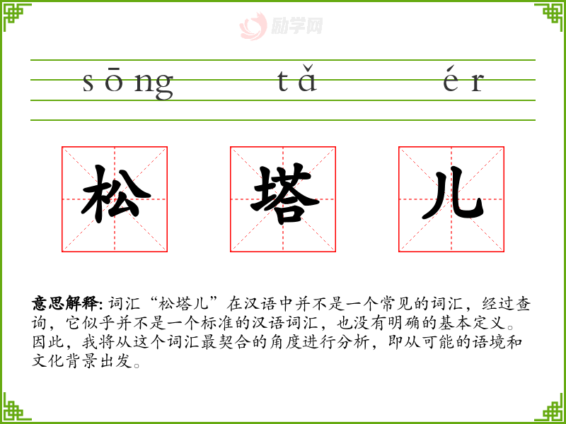 由于“松塔儿”不是一个标准的汉语词汇,我们无法给出一个确切的字面意思和基本含义。它可能是某个地区方言中的词汇,或者是某个特定社群中的俚语。
