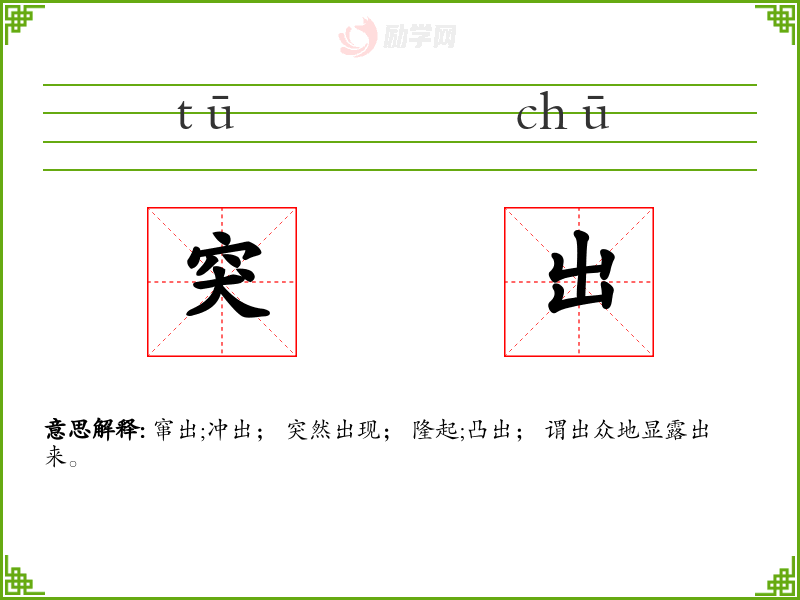 突出的意思是:窜出;冲出; 突然出现; 隆起;凸出; 谓出众地显露出来。