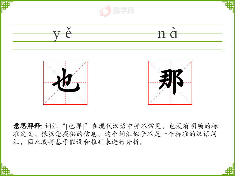 词汇“[也那]”在现代汉语中并不常见,也没有明确的标准定义。根据您提供的信息,这个词汇似乎不是一个标准的汉语词汇,因此我将基于假设和推测来进行分析。