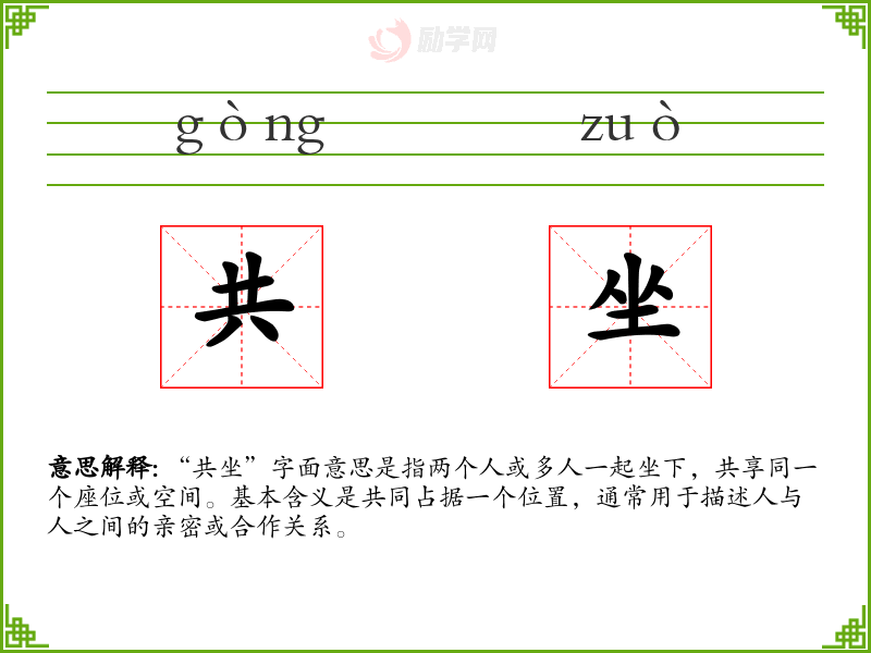 “共坐”字面意思是指两个人或多人一起坐下,共享同一个座位或空间。基本含义是共同占据一个位置,通常用于描述人与人之间的亲密或合作关系。