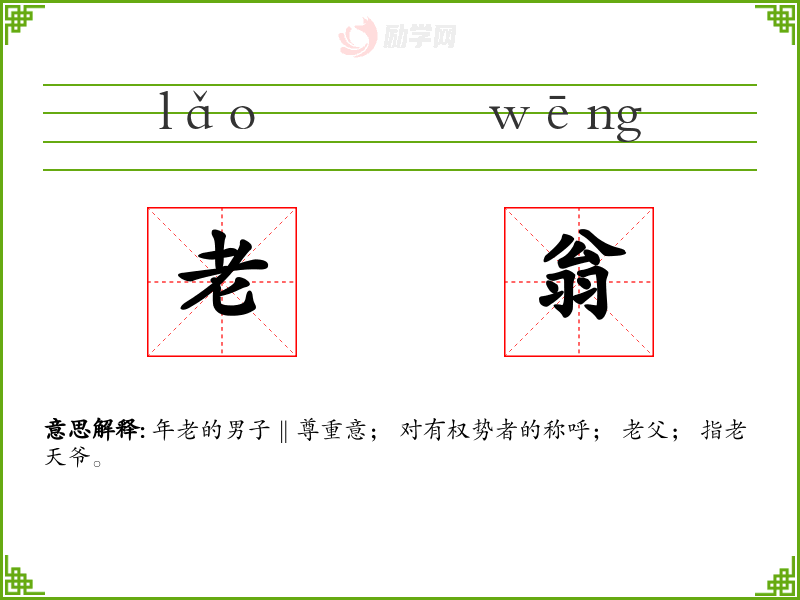 老翁的意思是:年老的男子‖尊重意; 对有权势者的称呼; 老父; 指老天爷。