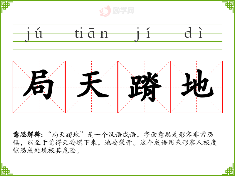 “局天蹐地”是一个汉语成语,字面意思是形容非常恐惧,以至于觉得天要塌下来,地要裂开。这个成语用来形容人极度惊恐或处境极其危险。