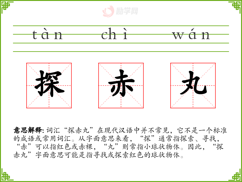 由于“探赤丸”不是一个常用词汇,其词源和历史演变不详。它可能是由几个常用汉字组合而成的临时性表达。