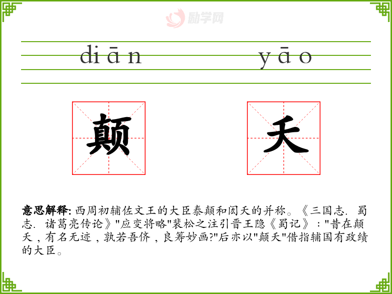 西周初辅佐文王的大臣泰颠和闳夭的并称。《三国志.蜀志.诸葛亮传论》"应变将略"裴松之注引晋王隐《蜀记》﹕"昔在颠夭﹐有名无迹﹐孰若吾侪﹐良筹妙画?"后亦以"颠夭"借指辅国有政绩的大臣。