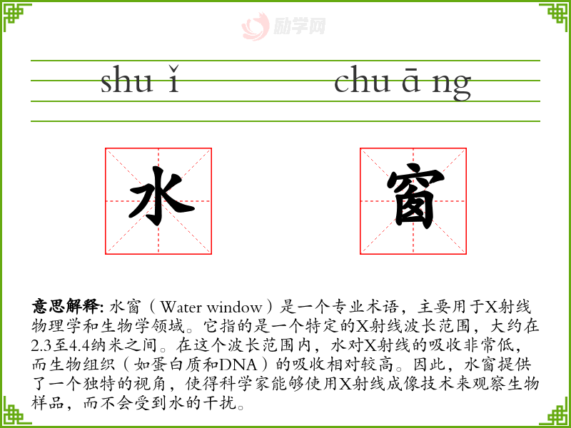 水窗(Water window)是一个专业术语,主要用于X射线物理学和生物学领域。它指的是一个特定的X射线波长范围,大约在2.3至4.4纳米之间。在这个波长范围内,水对X射线的吸收非常低,而生物组织(如蛋白质和DNA)的吸收相对较高。因此,水窗提供了一个独特的视角,使得科学家能够使用X射线成像技术来观察生物样品,而不会受到水的干扰。
