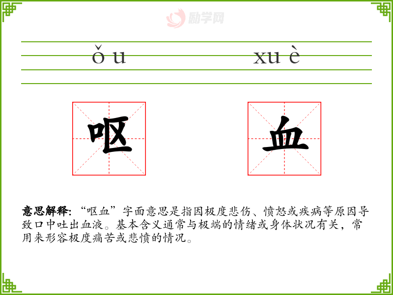 “呕血”字面意思是指因极度悲伤、愤怒或疾病等原因导致口中吐出血液。基本含义通常与极端的情绪或身体状况有关,常用来形容极度痛苦或悲愤的情况。