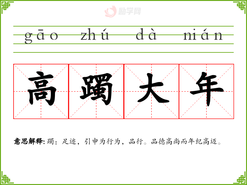 高躅大年的意思是:躅:足迹,引申为行为,品行。品德高尚而年纪高迈。