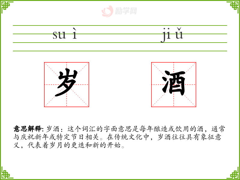 岁酒:这个词汇的字面意思是每年酿造或饮用的酒,通常与庆祝新年或特定节日相关。在传统文化中,岁酒往往具有象征意义,代表着岁月的更迭和新的开始。