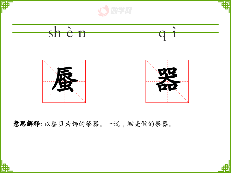 蜃器的意思是:以蜃贝为饰的祭器。一说﹐蛎壳做的祭器。