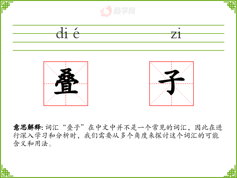 词汇“叠子”在中文中并不是一个常见的词汇,因此在进行深入学*和分析时,我们需要从多个角度来探讨这个词汇的可能含义和用法。
