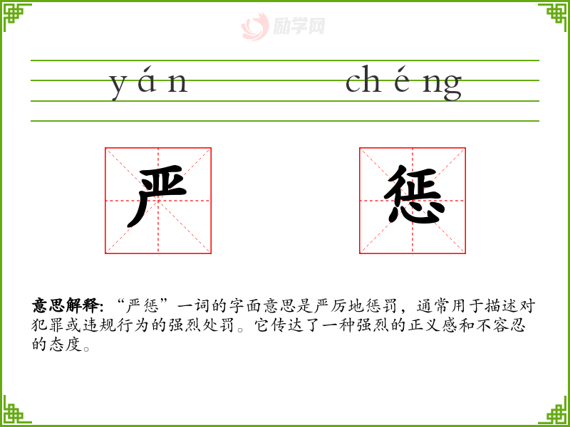 - 文学:在文学作品中,“严惩”常用于描述对恶行的惩罚,强调正义的必然性和严厉性。