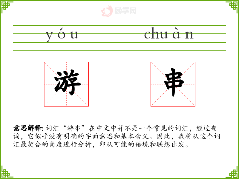由于“游串”不是一个标准词汇,我们无法提供确切的词源和历史演变。