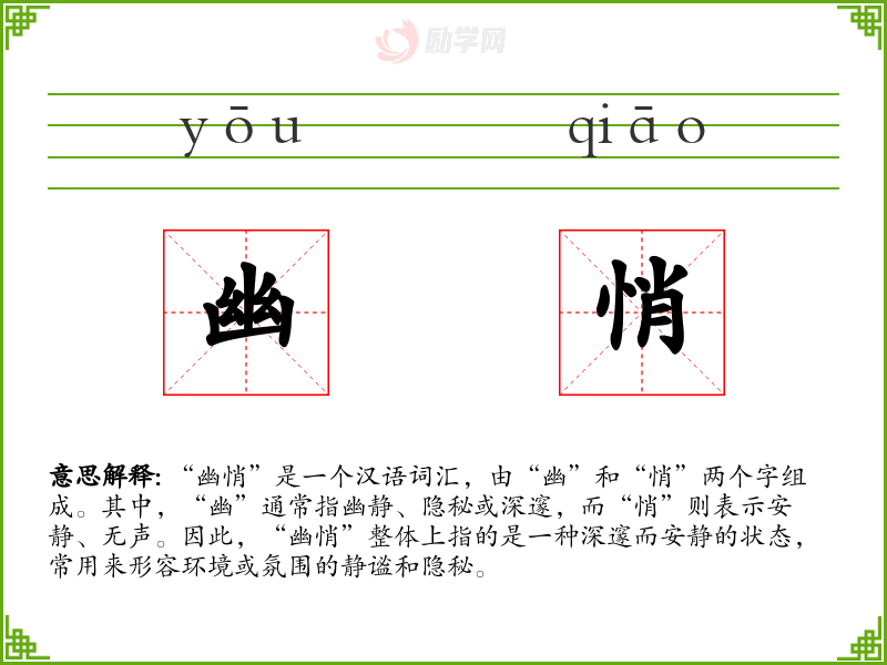 在英语中,“幽悄”可以对应为“serene”或“tranquil”,这两个词都强调了安静和平和的感觉,但“幽悄”更多了一层深邃和隐秘的意味。