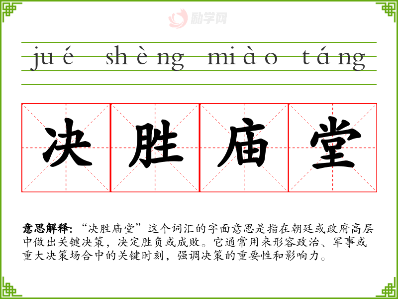 “决胜庙堂”是一个富含历史和文化意义的词汇,它不仅描述了政治决策的场景,也反映了人们对权力和智慧的尊重。在语言学*和表达中,理解和正确使用这样的词汇可以增强表达的深度和准确性。
