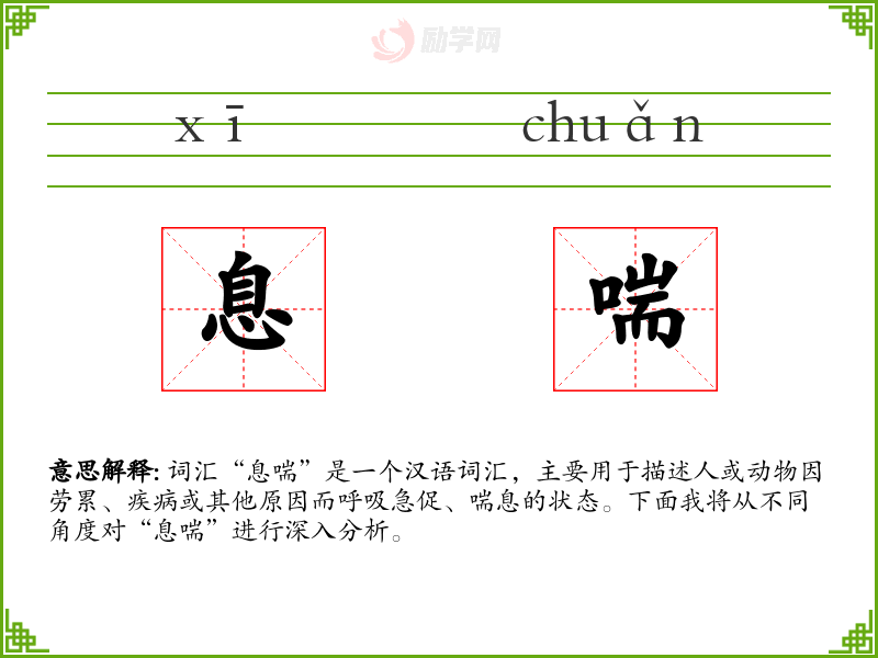 词汇“息喘”是一个汉语词汇,主要用于描述人或动物因劳累、疾病或其他原因而呼吸急促、喘息的状态。下面我将从不同角度对“息喘”进行深入分析。