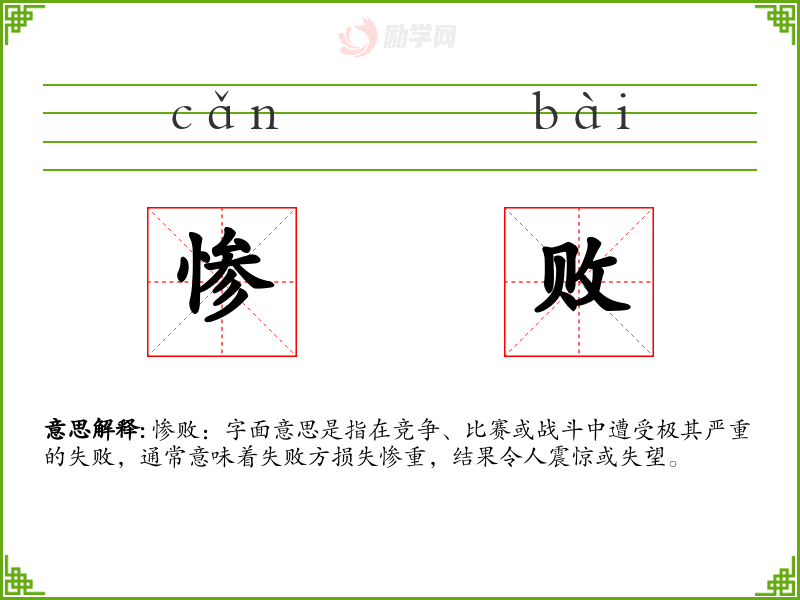 惨败:字面意思是指在竞争、比赛或战斗中遭受极其严重的失败,通常意味着失败方损失惨重,结果令人震惊或失望。