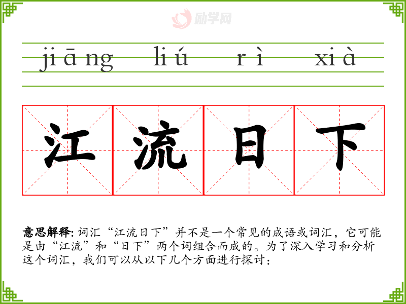 词汇“江流日下”并不是一个常见的成语或词汇,它可能是由“江流”和“日下”两个词组合而成的。为了深入学*和分析这个词汇,我们可以从以下几个方面进行探讨: