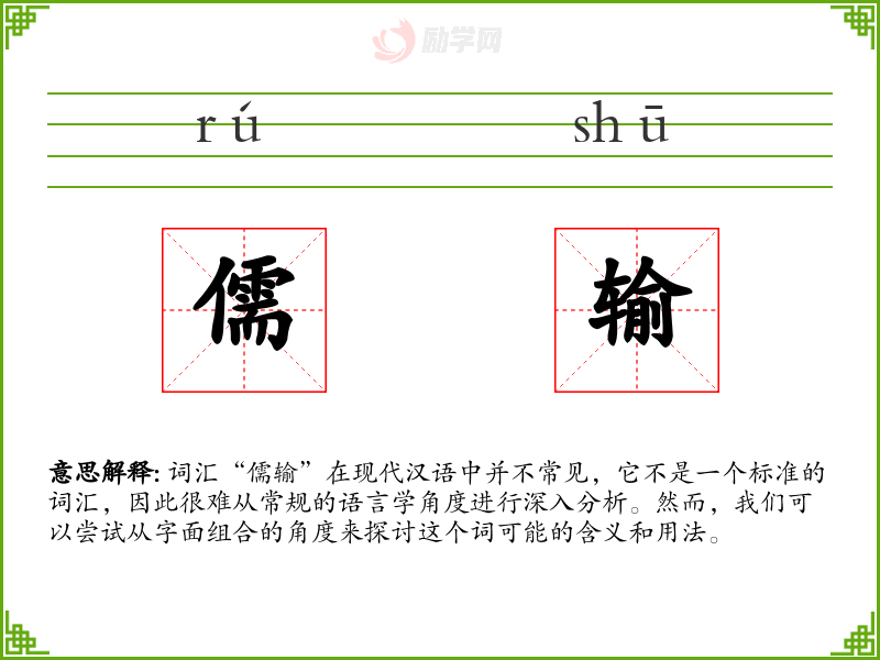 词汇“儒输”在现代汉语中并不常见,它不是一个标准的词汇,因此很难从常规的语言学角度进行深入分析。然而,我们可以尝试从字面组合的角度来探讨这个词可能的含义和用法。