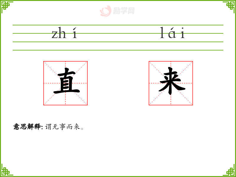 《说文》-勑,劳也。从力,來声。字亦作俫。 《诗·郑风·女曰鸡鸣》。高亨注:“来,借为勑。”-知子之来之,杂佩以赠之。 《汉书·平当传》-劳俫有意者。 《孟子·滕文公上》-劳之来之,匡之直之,辅之翼之。 《诗·魏风·硕鼠》-莫我肯勑。 《韩非子·王道》-贤者勑其材。
