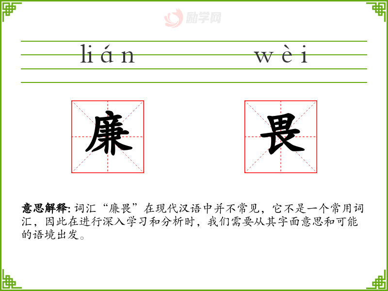 词汇“廉畏”在现代汉语中并不常见,它不是一个常用词汇,因此在进行深入学*和分析时,我们需要从其字面意思和可能的语境出发。