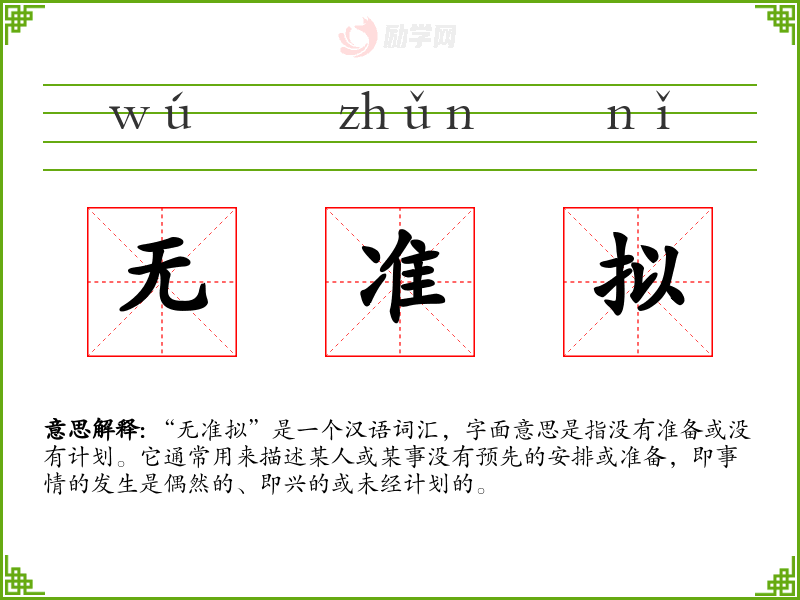 “无准拟”是一个汉语词汇,字面意思是指没有准备或没有计划。它通常用来描述某人或某事没有预先的安排或准备,即事情的发生是偶然的、即兴的或未经计划的。