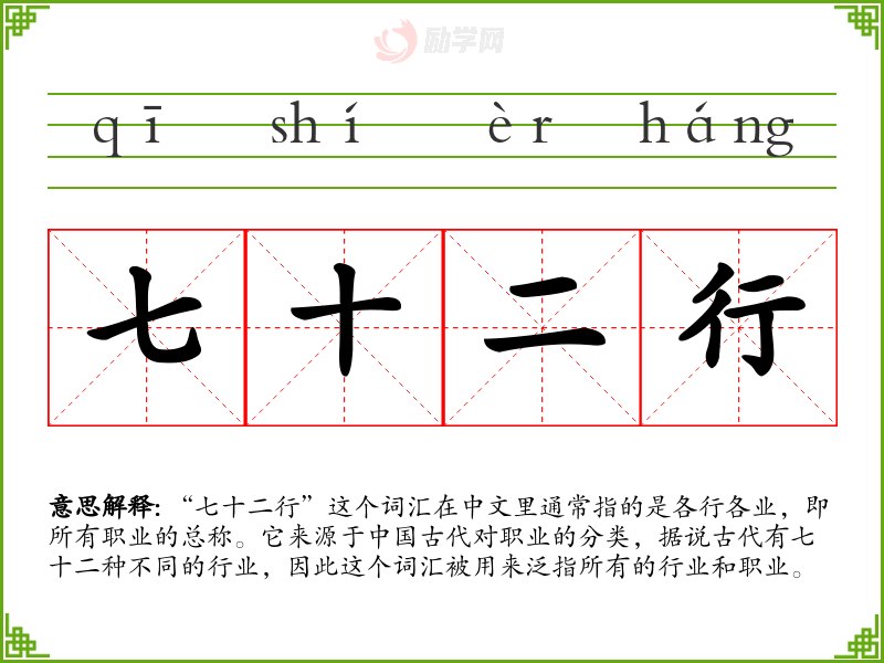 “七十二行”这个词汇不仅反映了职业的多样性,也体现了对每种职业的尊重和认可。在我的语言学*和表达中,理解和使用这个词汇可以帮助我更好地理解和尊重不同的职业,促进我与他人的交流和理解。