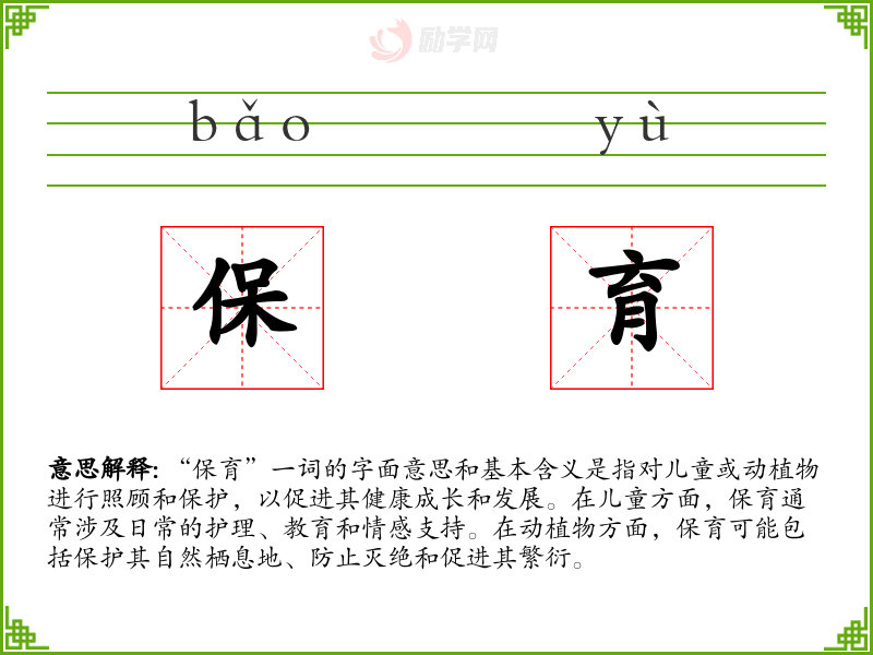 保育的意思是:经心照管幼儿,使好好成长:~院丨儿童~事业。