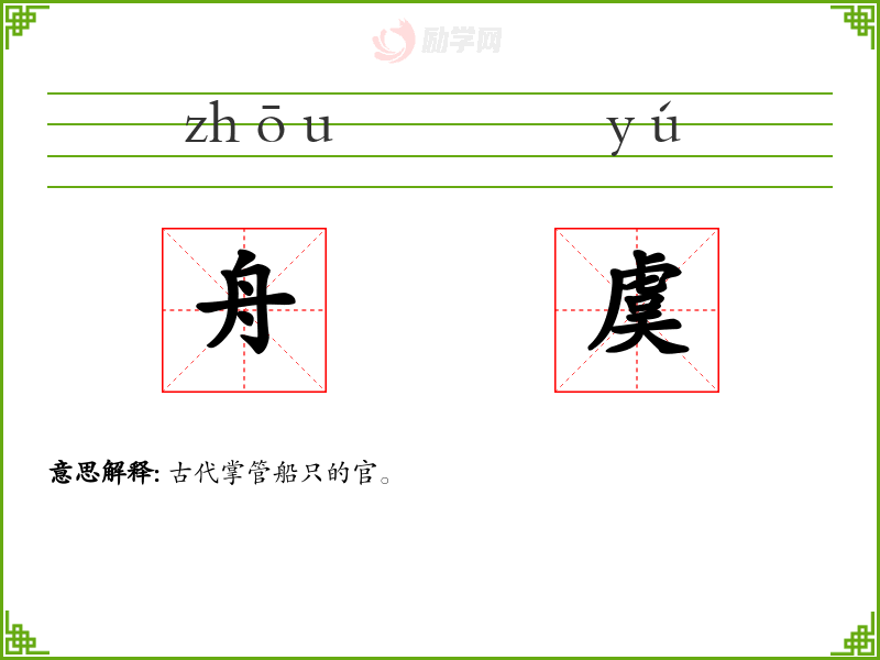 《说文》-舟,船也。古者共鼓货狄,刳木为舟,剡木为楫,以济不通。象形。 《方言九》-自关而西谓之船,自关而东谓之舟。 《考工记·总目》-作舟以行水。 《墨子·节用》。按,舟之始,古以自空大木为之,曰俞,后因集板为之,曰舟,又以其沿水而行曰船也。-舟以行川谷。 《易·系辞下》-刳木为舟,剡木为楫。 《诗·邶风·二子乘舟》-二子乘舟,泛泛其逝。 李白《早发白帝城》-两岸猿声啼不住,轻舟已过万重山。 宋·苏轼《石钟山记》-舟人大恐。(舟人,船夫)。 宋·陆游《过小孤山大孤山》-舟人指点。