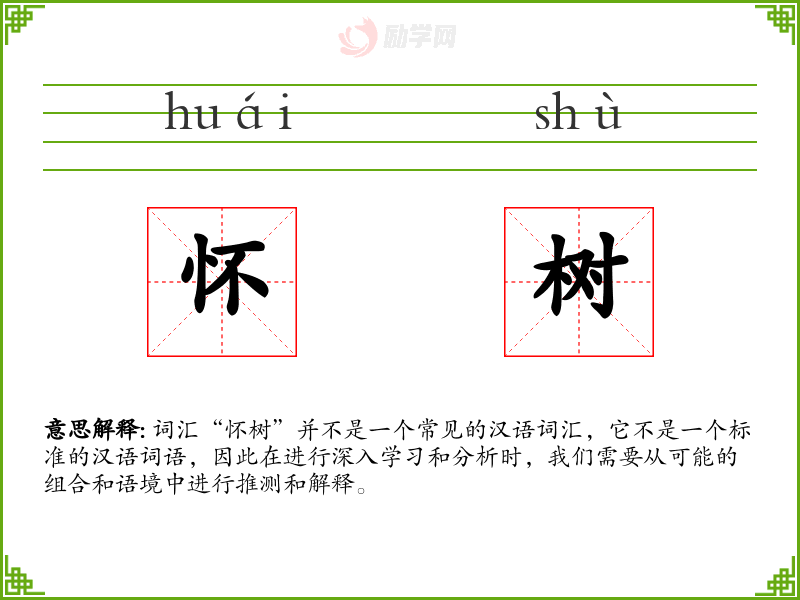 词汇“怀树”并不是一个常见的汉语词汇,它不是一个标准的汉语词语,因此在进行深入学习和分析时,我们需要从可能的组合和语境中进行推测和解释。