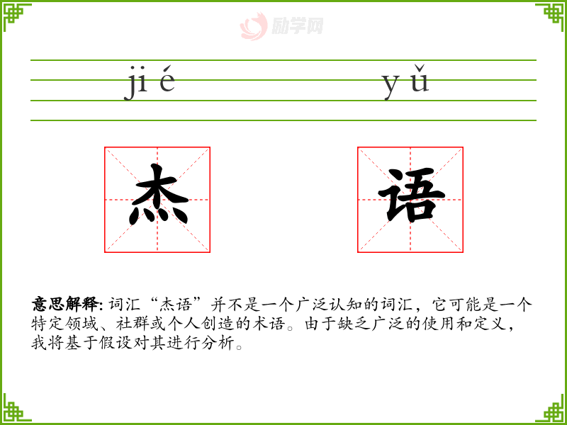 词汇“杰语”并不是一个广泛认知的词汇,它可能是一个特定领域、社群或个人创造的术语。由于缺乏广泛的使用和定义,我将基于假设对其进行分析。