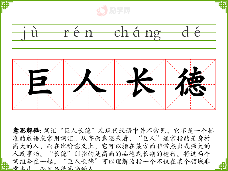 由于“巨人长德”不是一个常用词汇,其词源和演变不太明确。但可以推测,它可能是由“巨人”和“长德”这两个词组合而成,用以强调某人在才能和品德上的双重优势。