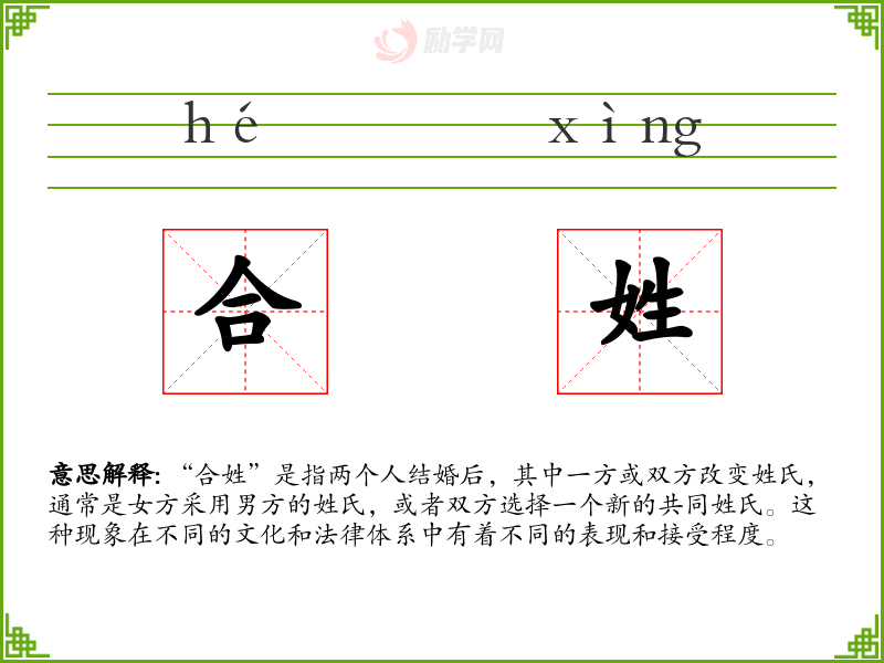 “合姓”是指两个人结婚后,其中一方或双方改变姓氏,通常是女方采用男方的姓氏,或者双方选择一个新的共同姓氏。这种现象在不同的文化和法律体系中有着不同的表现和接受程度。