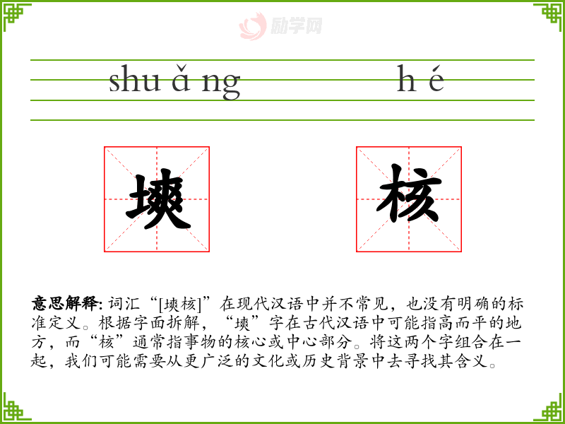 词汇“[塽核]”在现代汉语中并不常见,也没有明确的标准定义。根据字面拆解,“塽”字在古代汉语中可能指高而平的地方,而“核”通常指事物的核心或中心部分。将这两个字组合在一起,我们可能需要从更广泛的文化或历史背景中去寻找其含义。