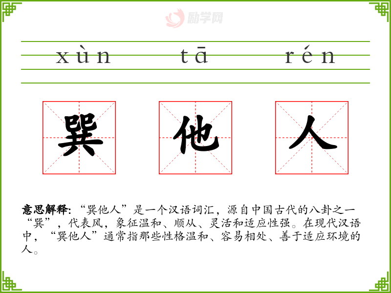 “巽”字源自《易经》中的八卦之一,代表风,象征着温和与顺从。随着时间的推移,“巽他人”逐渐被用来形容具有这些特质的人。