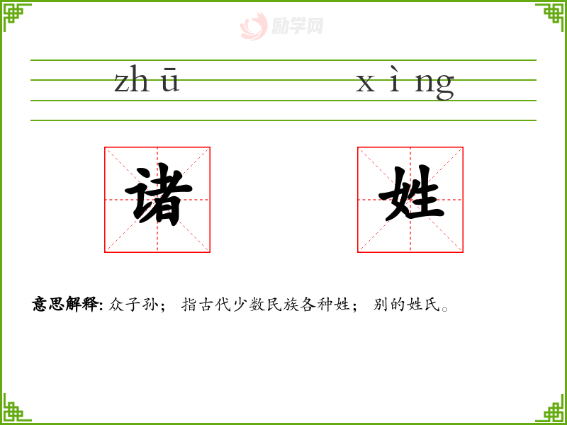 诸姓的意思是:众子孙; 指古代少数民族各种姓; 别的姓氏。