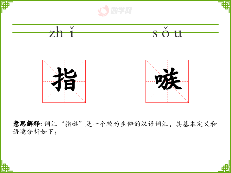 词汇“指嗾”是一个较为生僻的汉语词汇,其基本定义和语境分析如下:
