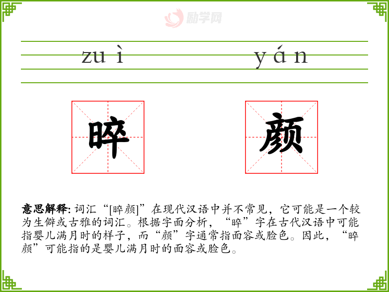- 反义词:老态龙钟、沧桑面容(这些反义词并不完全对应,因为“晬颜”特指婴儿的面容)