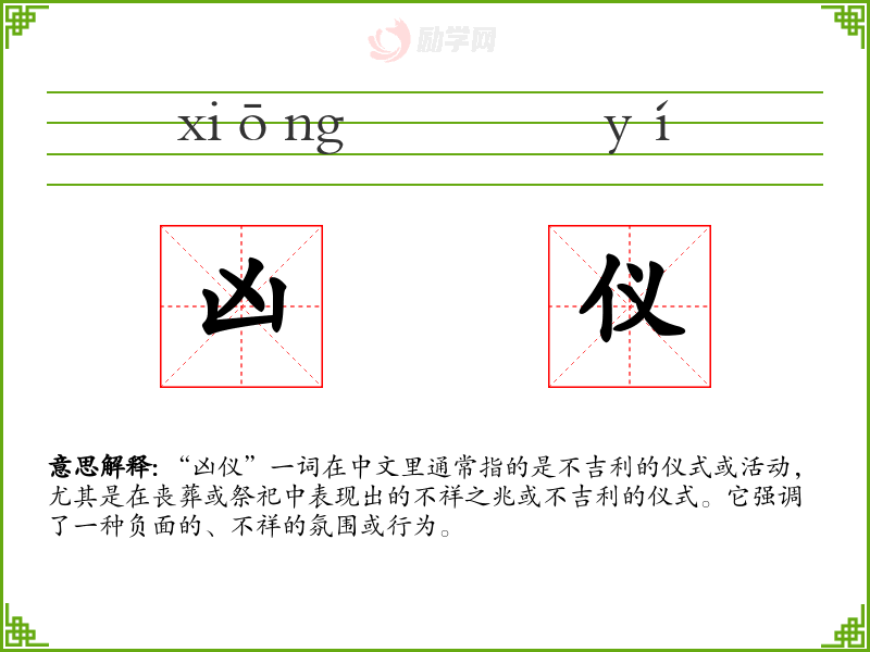 “凶仪”一词在中文里通常指的是不吉利的仪式或活动,尤其是在丧葬或祭祀中表现出的不祥之兆或不吉利的仪式。它强调了一种负面的、不祥的氛围或行为。