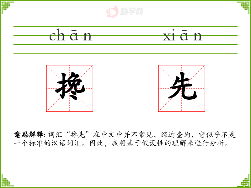 词汇“搀先”在中文中并不常见,经过查询,它似乎不是一个标准的汉语词汇。因此,我将基于假设性的理解来进行分析。