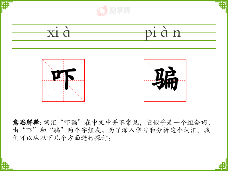 词汇“吓骗”在中文中并不常见,它似乎是一个组合词,由“吓”和“骗”两个字组成。为了深入学习和分析这个词汇,我们可以从以下几个方面进行探讨: