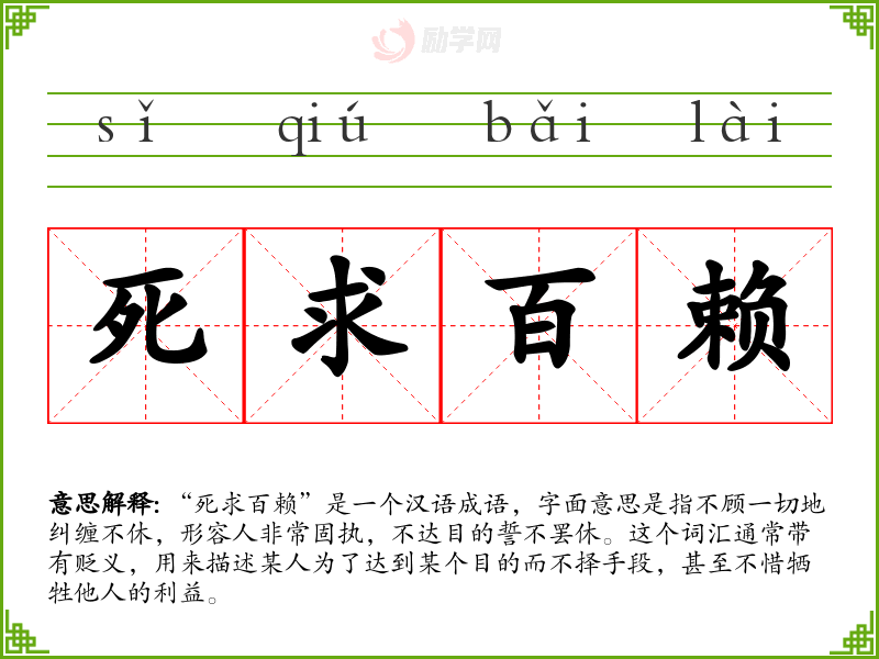 “死求百赖”是一个汉语成语,字面意思是指不顾一切地纠缠不休,形容人非常固执,不达目的誓不罢休。这个词汇通常带有贬义,用来描述某人为了达到某个目的而不择手段,甚至不惜牺牲他人的利益。