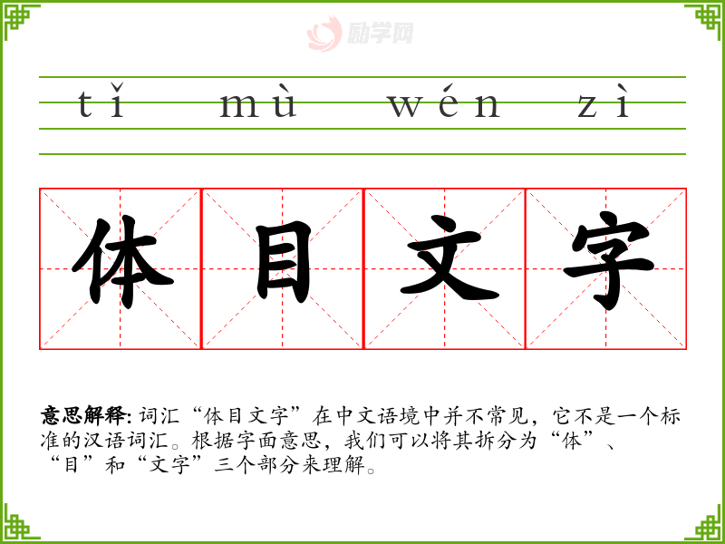 词汇“体目文字”在中文语境中并不常见,它不是一个标准的汉语词汇。根据字面意思,我们可以将其拆分为“体”、“目”和“文字”三个部分来理解。