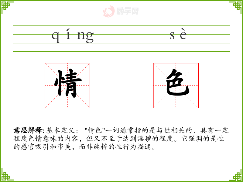 基本定义: "情色"一词通常指的是与性相关的、具有一定程度色情意味的内容,但又不至于达到淫秽的程度。它强调的是性的感官吸引和审美,而非纯粹的性行为描述。