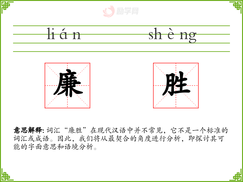 词汇“廉胜”在现代汉语中并不常见,它不是一个标准的词汇或成语。因此,我们将从最契合的角度进行分析,即探讨其可能的字面意思和语境分析。