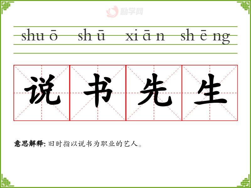 说书先生的意思是:旧时指以说书为职业的艺人。
