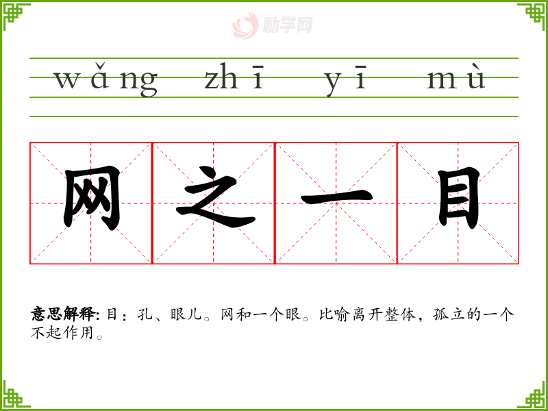 网之一目的意思是:目:孔、眼儿。网和一个眼。比喻离开整体,孤立的一个不起作用。