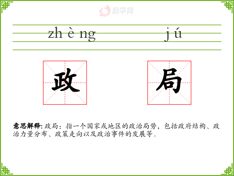 - 文学:在文学作品中,政局可能被用来描绘一个时代的背景,如“动荡的政局使得整个国家陷入不安。”