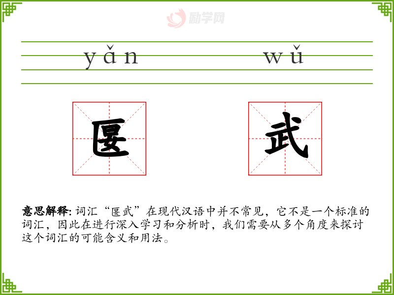 词汇“匽武”在现代汉语中并不常见,它不是一个标准的词汇,因此在进行深入学习和分析时,我们需要从多个角度来探讨这个词汇的可能含义和用法。