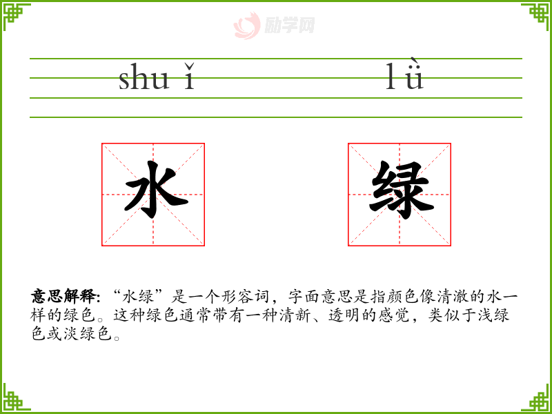 “水绿”是一个形容词,字面意思是指颜色像清澈的水一样的绿色。这种绿色通常带有一种清新、透明的感觉,类似于浅绿色或淡绿色。